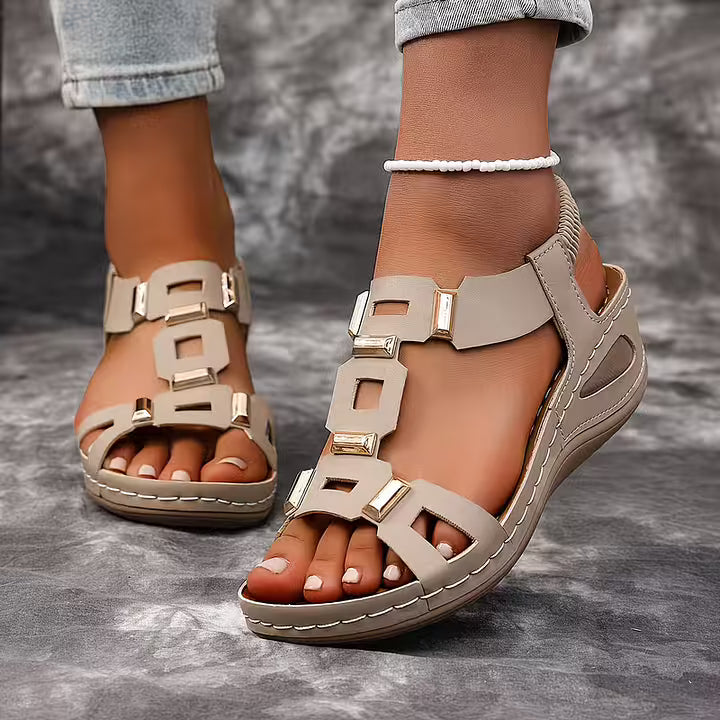 These open toe sandals feature a structured multi-strap upper accented with metallic details for a bold finish. The slingback construction and supportive sole create a balanced silhouette suited for daily wear, travel, and warm-weather styling.